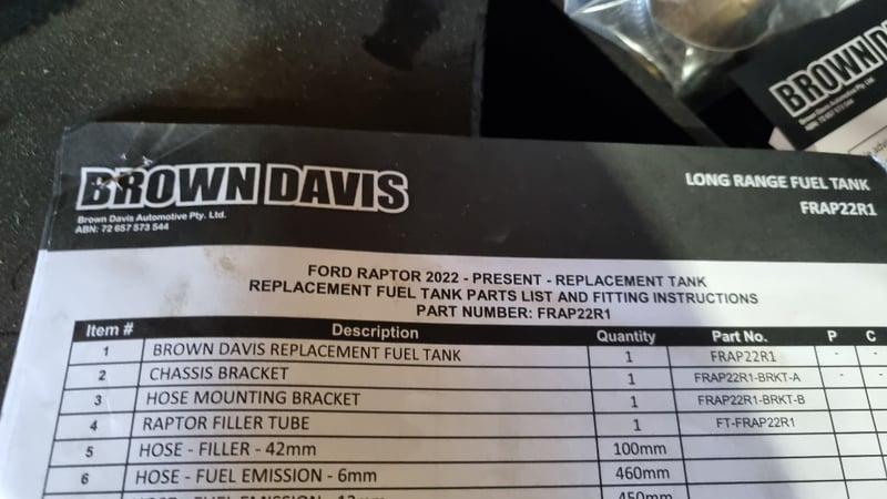 Long Range Fuel Tank, Brown Davis , Suits 2022 For RaptorPARTS MAY BE MISSINGLocation: South Lismore, NSW Inspection: Wednesday 22nd of April, 9am to 3pm Collections: STRICTLY Tuesday the 28th April to Friday 1st May