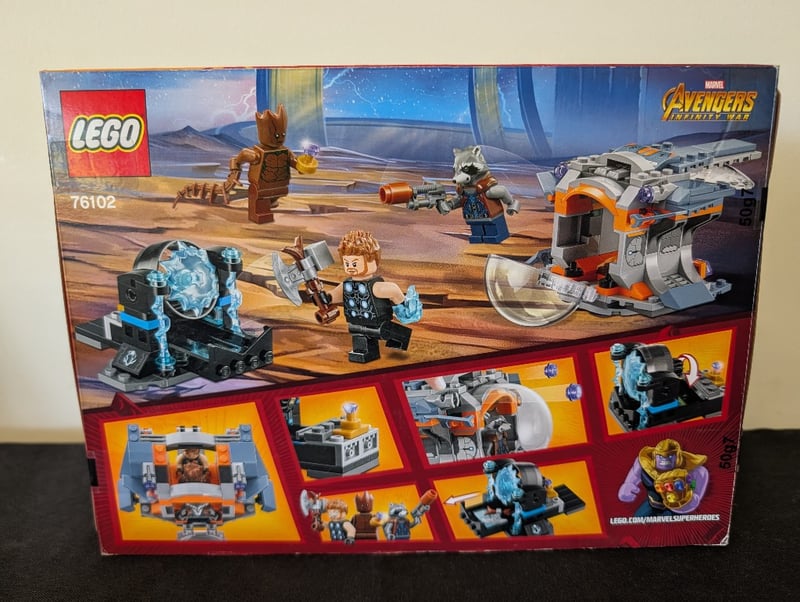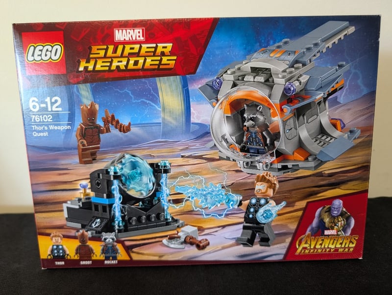 LEGO MARVEL SUPER HEROES 76102 THOR'S WEAPON QUEST SETItem Size: Height: 35cm, Width: 35cm, Depth: 35cm, Weight: 2KgLego Marvel Super Heroes Set 76102 "Thor'S Weapon Quest" Featuring A Detailed Spacecraft With Orange And Grey Colour Scheme, Includes Minifigures Of Thor, Groot, And Rocket. The Set Comprises A Motorised Aircraft With Opening Cockpit, A Buildable Cosmic Weapon Platform With Translucent Blue Elements, And Various Accessories. Recommended For Ages 6-12.Condition: Good - Refer To Images584531+23