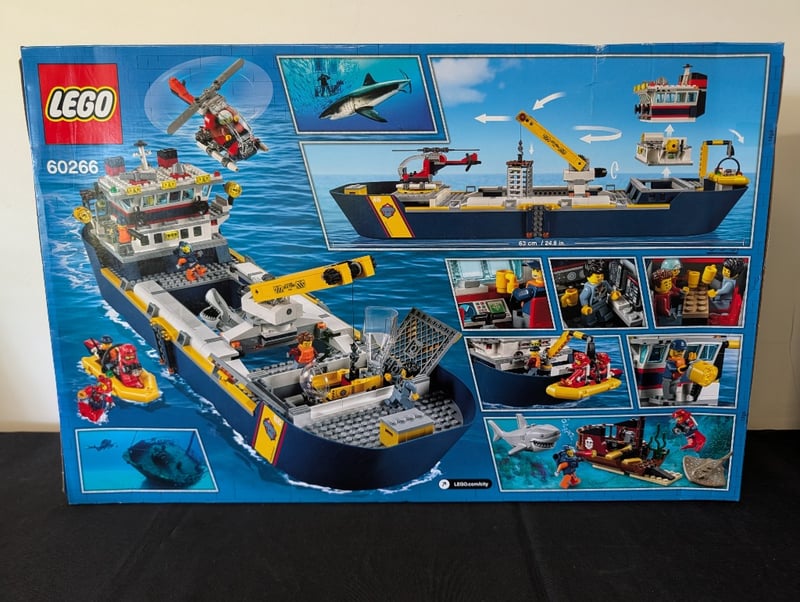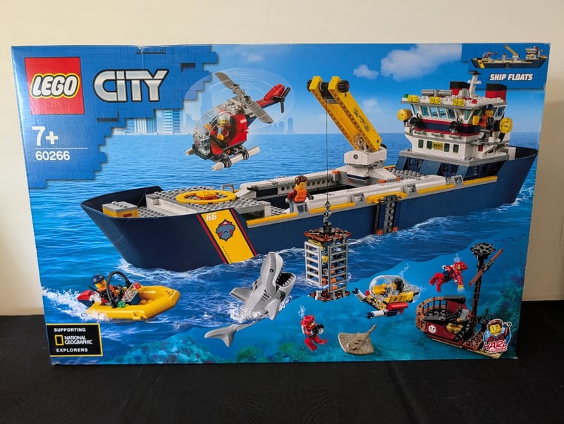 Lego City Set 60266 Featuring A Comprehensive Ocean Exploration Theme With A Large Cargo/Research Vessel As The Centrepiece. The Set Includes A Detailed Ship With Working Crane, Rescue Helicopter, Shark-Research Submersible, Speedboat, And Diving Equipment. Complete With Multiple Minifigures, Animal Elements (Shark And Manta Ray), And Supporting National Geographic Explorers Branding. Suitable For Ages 7+.