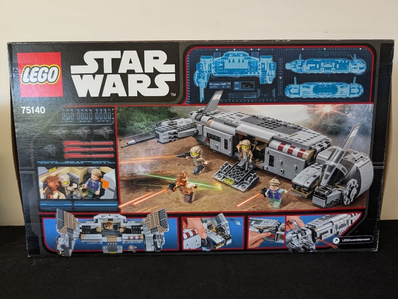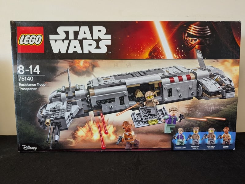 Sealed Lego Star Wars Set 75140 Featuring The Resistance Troop Transporter With Opening Cargo Bay, Detachable Speeder Bike, And Four Minifigures Including Princess Leia. Age Range 8-14. Complete With Original Packaging Displaying Construction Schematics And Detailed Product Photography.