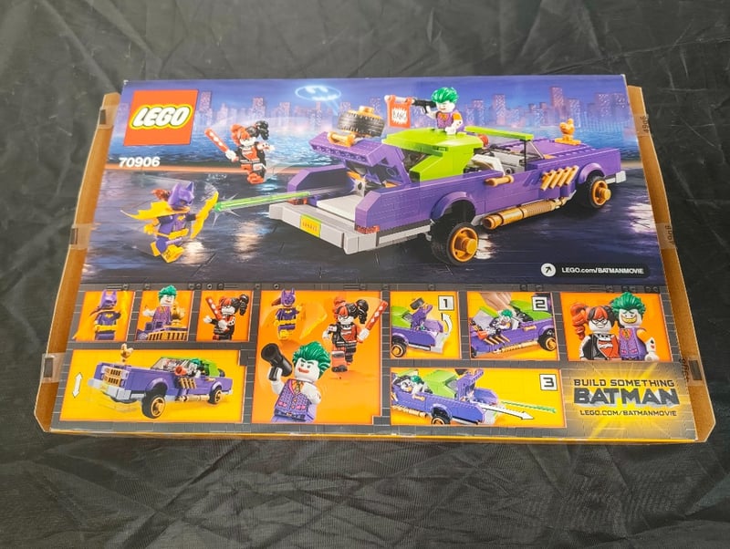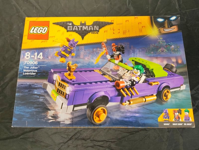 Lego Batman Movie Construction Set Featuring The Joker'S Notorious Lowrider Vehicle (Set 70906). Ages 8-14. Includes Minifigures Of The Joker, Harley Quinn, And The Joker'S Henchman. Purple And Yellow Lowrider Car With Lime-Green Detachable Elements, Gold-Coloured Wheels, And Motorized Cannon Accessories. Complete With Illustrated Instruction Manual. Unopened, Factory-Sealed Original Packaging.