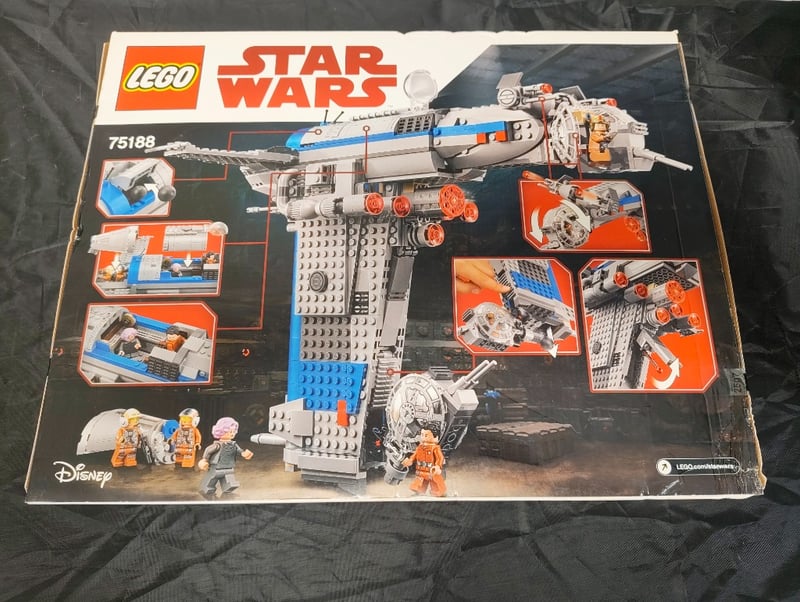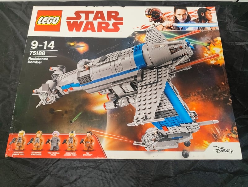 Lego Star Wars Set 75188 Featuring The Resistance Bomber Spacecraft With Buildable Bomber Vessel, Detachable Cockpit Section, Rotating Turrets With Spring-Loaded Projectile Shooters, Landing Gear, And Five Minifigures Including Resistance Pilot And Gunner Variants. Original Box Showing Box Art Depicting Characters From The Sequel Trilogy Against Space Battle Backdrop With Explosions. Age Rating 9-14 Years. Box Displays Comprehensive Instruction Images And Features Components Visible On Reverse