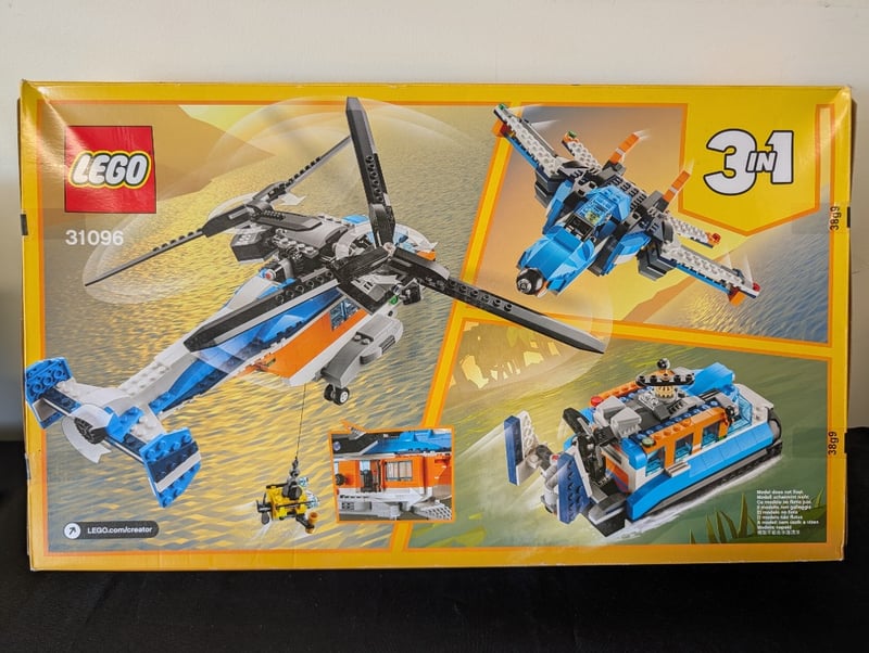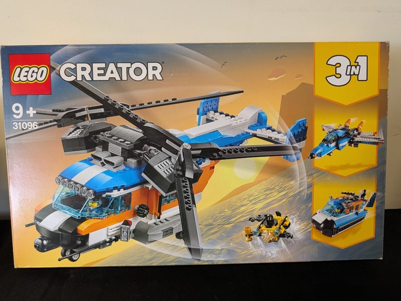 Lego Creator 3-In-1 Set 31096 Featuring A Buildable Rescue Helicopter With Orange And Blue Livery, Transforming Into An Airplane And Hovercraft. Includes Minifigure Accessories And Detailed Rotor Blades. Suitable For Builders Aged 9+. Unopened Original Packaging In Excellent Condition.