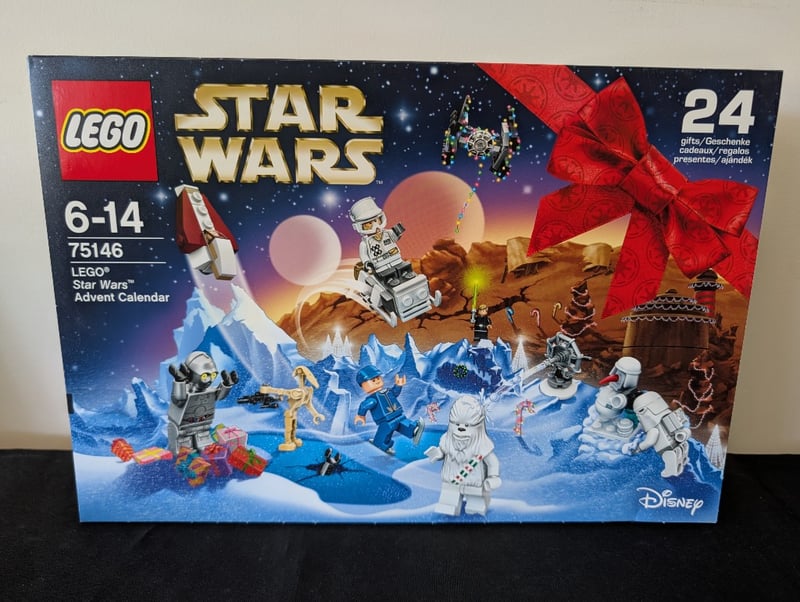 Lego Star Wars Advent Calendar Set 75146, Featuring 24 Daily Gifts With Minifigures And Accessories. Includes Iconic Star Wars Characters And Spacecraft. Original Packaging Shows Festive Winter-Themed Scenes With Desert And Snowy Landscapes. Age Range 6-14 Years. Complete With Illustrated Box Displaying All Collectible Items.