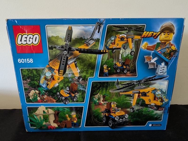 LEGO CITY JUNGLE CARGO HELICOPTER SET 60158Item Size: Height: 28cm, Width: 38cm, Depth: 12cm, Weight: 2KgComplete Lego City Set 60158 Featuring A Yellow And Black Cargo Helicopter With Opening Cockpit, Motorized Lift Mechanism, Atv Vehicle, And Jungle Base Camp Setting With Minifigures And Accessory Pieces.Condition: Good - Refer To Images584531+97
