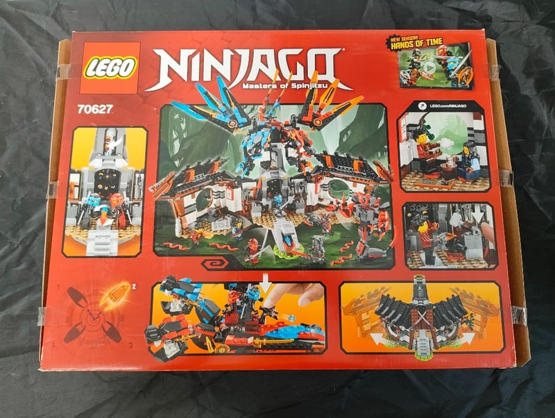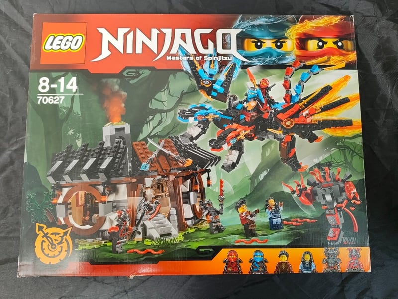 Lego Ninjago Masters Of Spinjitzu Set 70627 Featuring A Detailed Dragon'S Forge Structure With Flame-Adorned Roofing, Multiple Minifigures Including Ninja Warriors In Red And Blue Variants, Articulated Dragon Construction With Poseable Limbs And Extended Wings, Complementary Building Accessories, And Original Retail Packaging With Printed Instruction Imagery And Character Specifications. Complete With All Visible Components And Architectural Elements Displayed Across Front And Reverse Box Panels