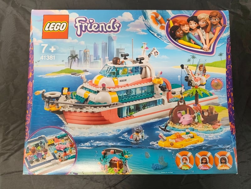 Lego Friends Cruise Ship Building Set 41381 Featuring A Substantial Multi-Level Rescue Vessel With Detailed Interior Compartments, Accompanying Smaller Watercraft Including A Yellow Speedboat And Pink Jet Ski, Island Terrain With Palm Trees, And Five Minifigures. The Set Includes Intricate Play Features Such As Functioning Crane, Detailed Cabin Spaces, Recreational Areas, And Authentic Maritime Rescue Equipment. Original Packaging With Box Art Displaying All Components And Scene Configurations