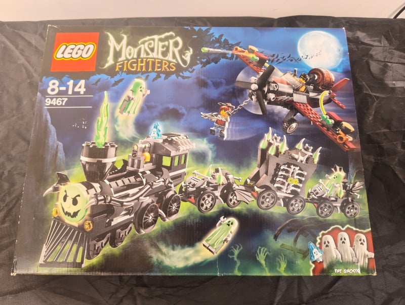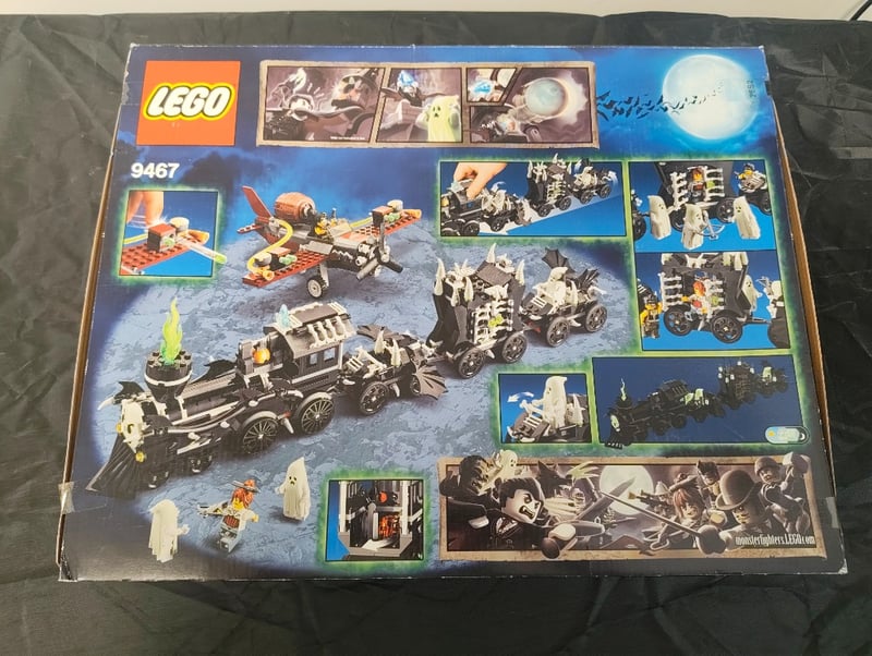Lego Monster Fighters Set 9467 Featuring A Motorized Haunted Train Locomotive With Ghost-Themed Railway Cars, Minifigures, And Supernatural Accessories. Original 2012 Release For Ages 8-14, Includes Buildable Train Engine With Working Motor, Multiple Cursed Carriages, Ghost Minifigures, And Monster-Themed Structural Elements With Phosphorescent Green Details.