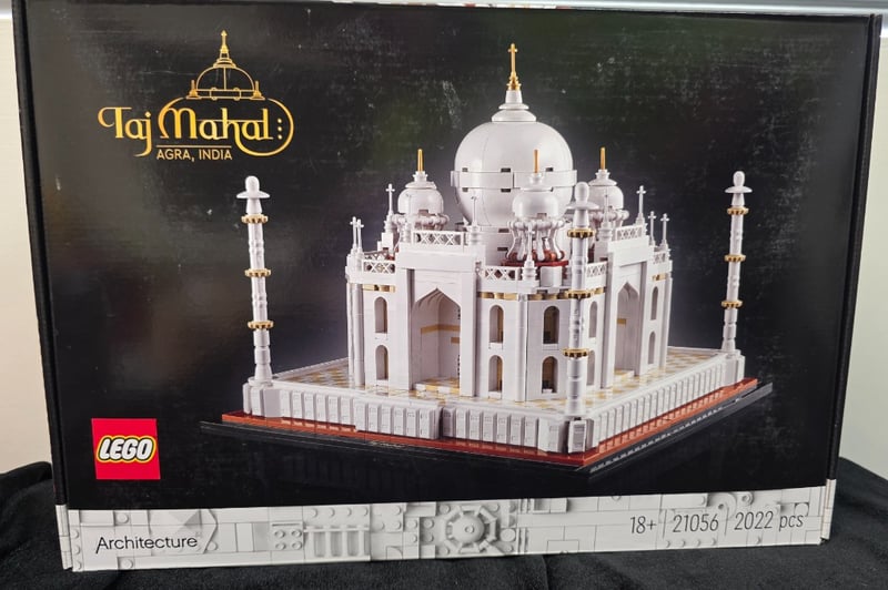 Lego Architecture Taj Mahal (Set 21056) Featuring 2022 Pieces. Adult-Oriented Architectural Model Set With White And Cream-Coloured Bricks, Gold-Accented Domes, Minarets, And Detailed Facade Elements. Includes Display Base With Decorative Plinth. Original Sealed Packaging With Comprehensive Instruction Manual Visible. Authentic Representation Of Agra'S Iconic Monument With Symmetrical Design, Arched Doorways, And Ornamental Spires.