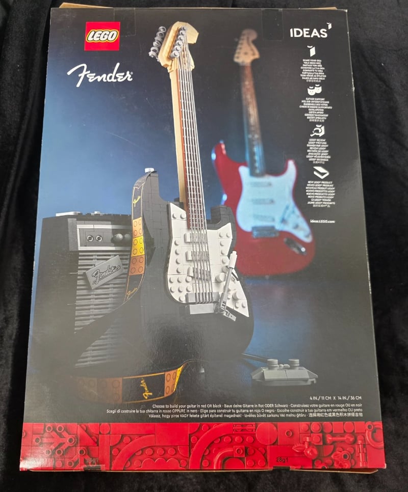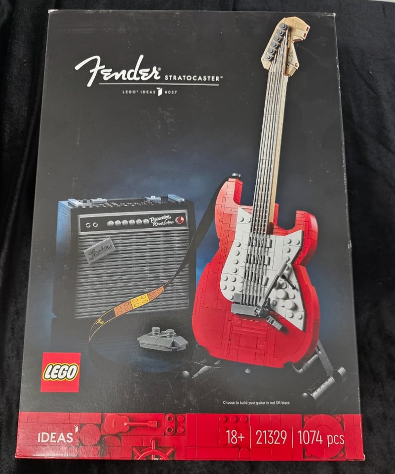 Lego Ideas #21329 Fender Stratocaster Iconic Electric Guitar Construction Set Featuring 1074 Pieces. Includes Buildable Red Or Black Stratocaster Guitar With Detailed Neck, Body, And Pickguard; Functional Fender Amplifier Model; Guitar Cable; And Display Stand. Age 18+. Box Shows Moderate Wear Consistent With Display Storage.