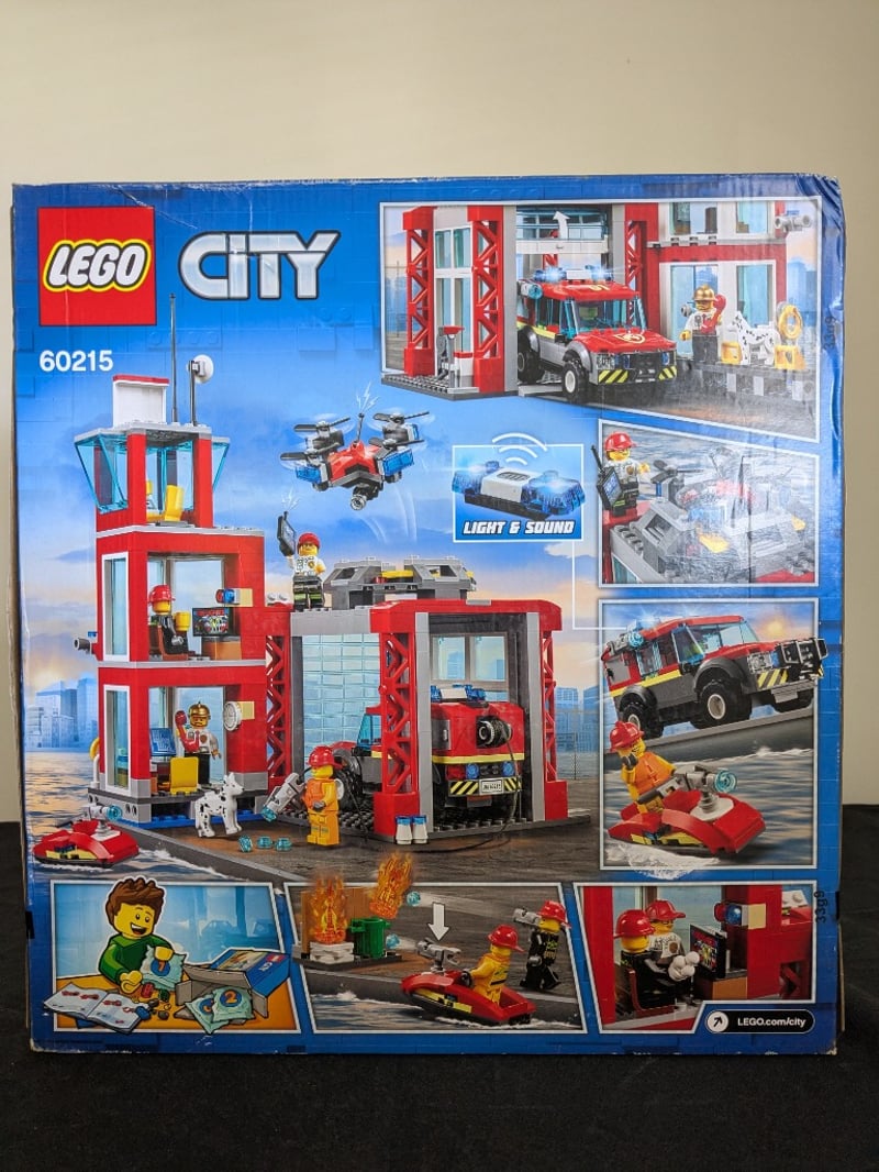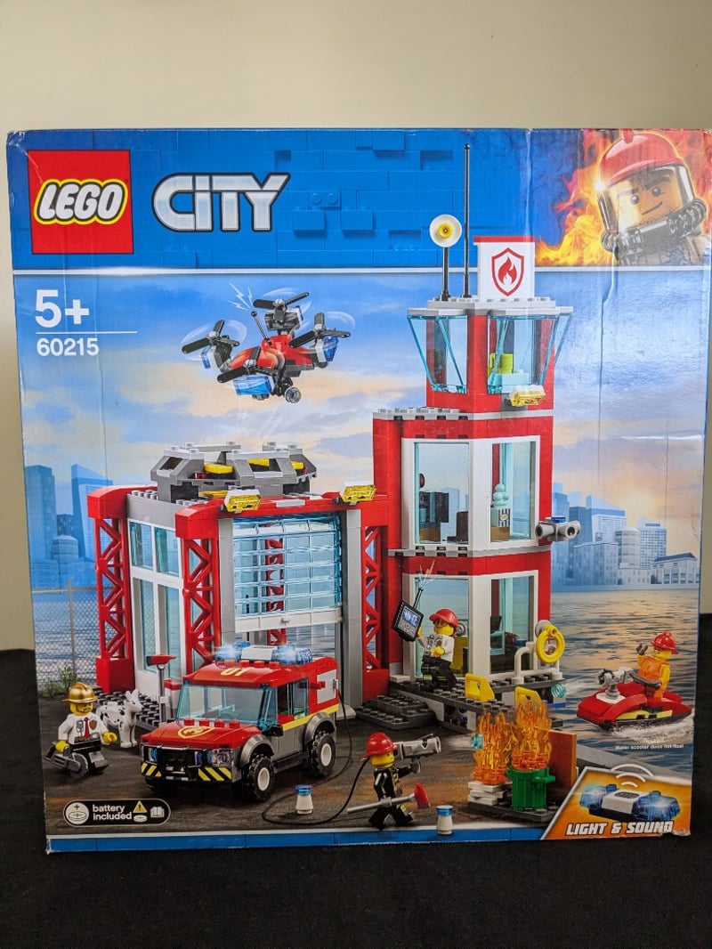 Lego City Fire Station Playset (Set 60215) Featuring A Multi-Level Red And White Fire Station Building With Functional Light And Sound Effects, Included Fire Truck With Opening Doors, Rescue Drone, Fire Boat, And Five Minifigures. Complete With Accessories Including Ladder, Hose, And Flame Elements. Age 5+. Battery-Operated Electronics. Original Retail Packaging With Minimal Shelf Wear.