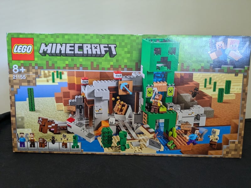 Lego Minecraft Set 21155 Featuring A Multi-Level Mine Structure With Creeper Character, Tnt Blocks, Minecart Track System, And Multiple Minifigures Including Steve And Zombie Variants. Includes Modular Green Creeper Head Structure, Underground Cavern Sections, Water Features, And Comprehensive Accessories. Original Packaging With Construction Imagery And Instruction References Visible.