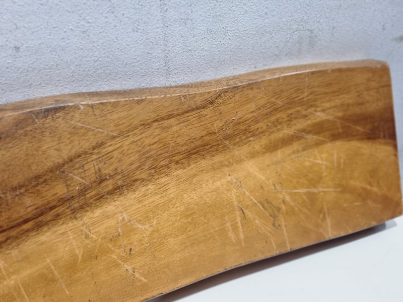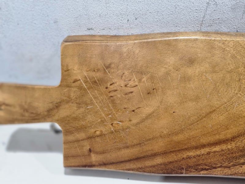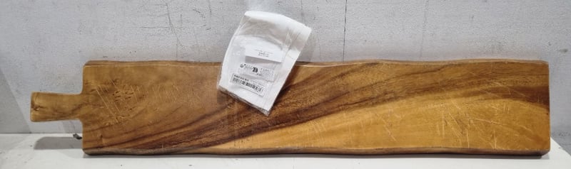 Wooden chacuterie board featuring natural grain patterns with warm honey and darker walnut tones. Long rectangular design with integrated handle cutout for convenient serving.