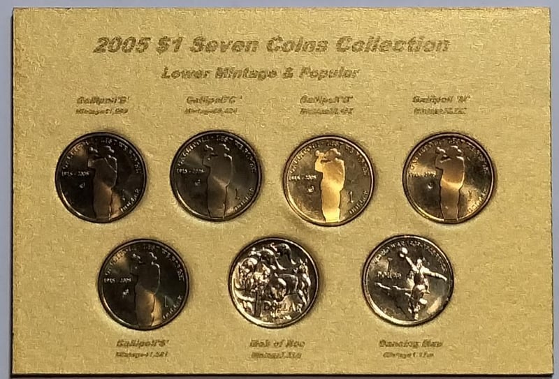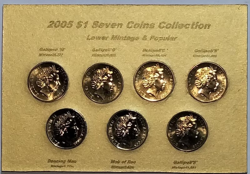 2005 SEVEN $1 COINS COLLECTION GALLIPOLI LOWER MINTAGE GALLIPOLI G & M MARK, MOB OF ROOS INCLUDED Condition: UncEx Mint Roll/Folder488584+17