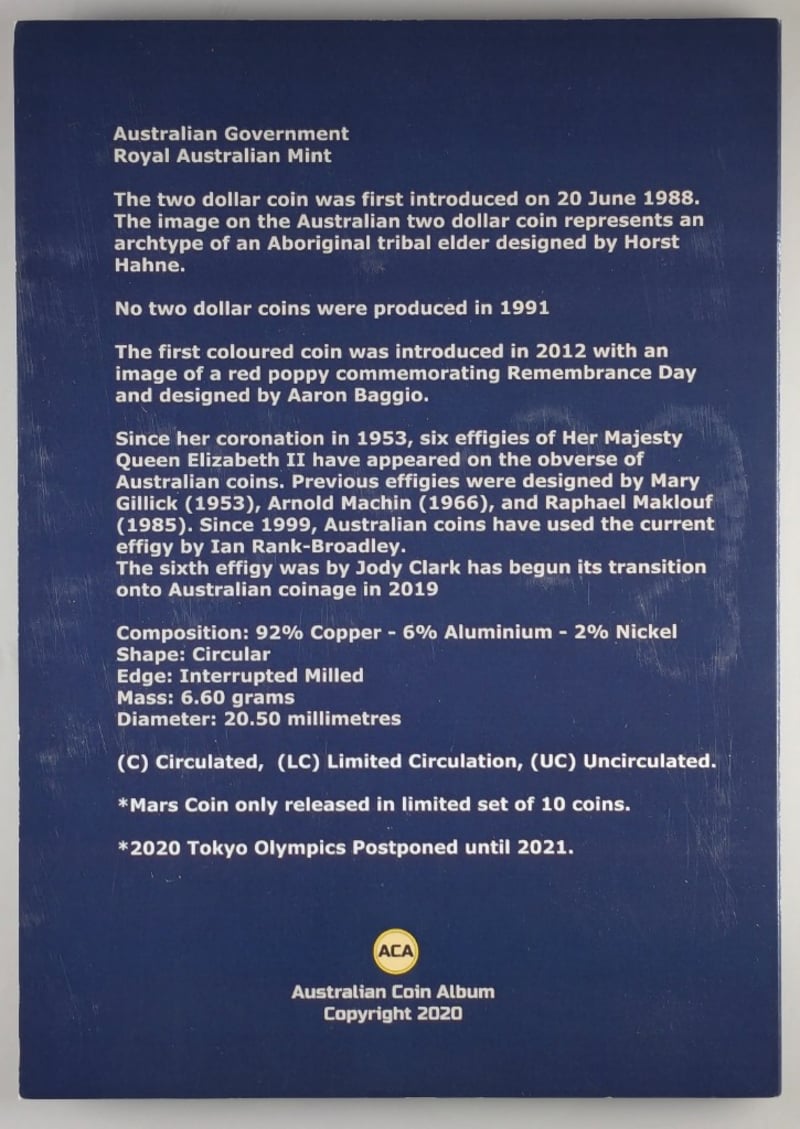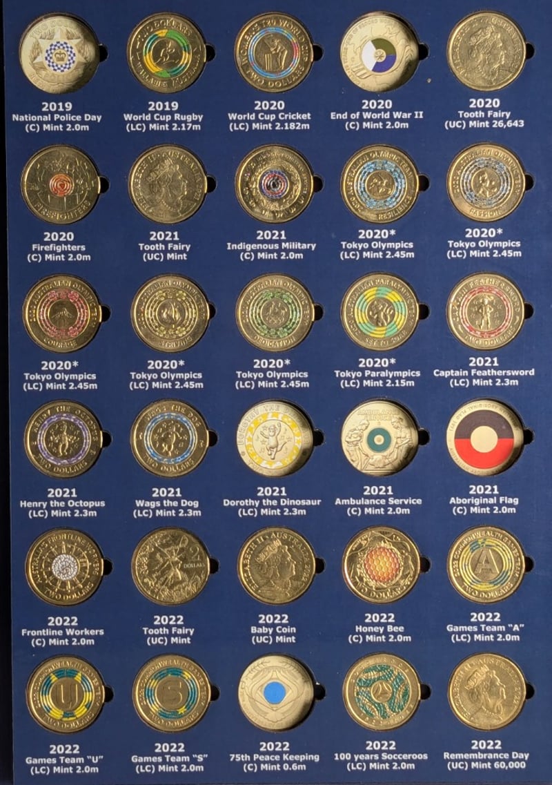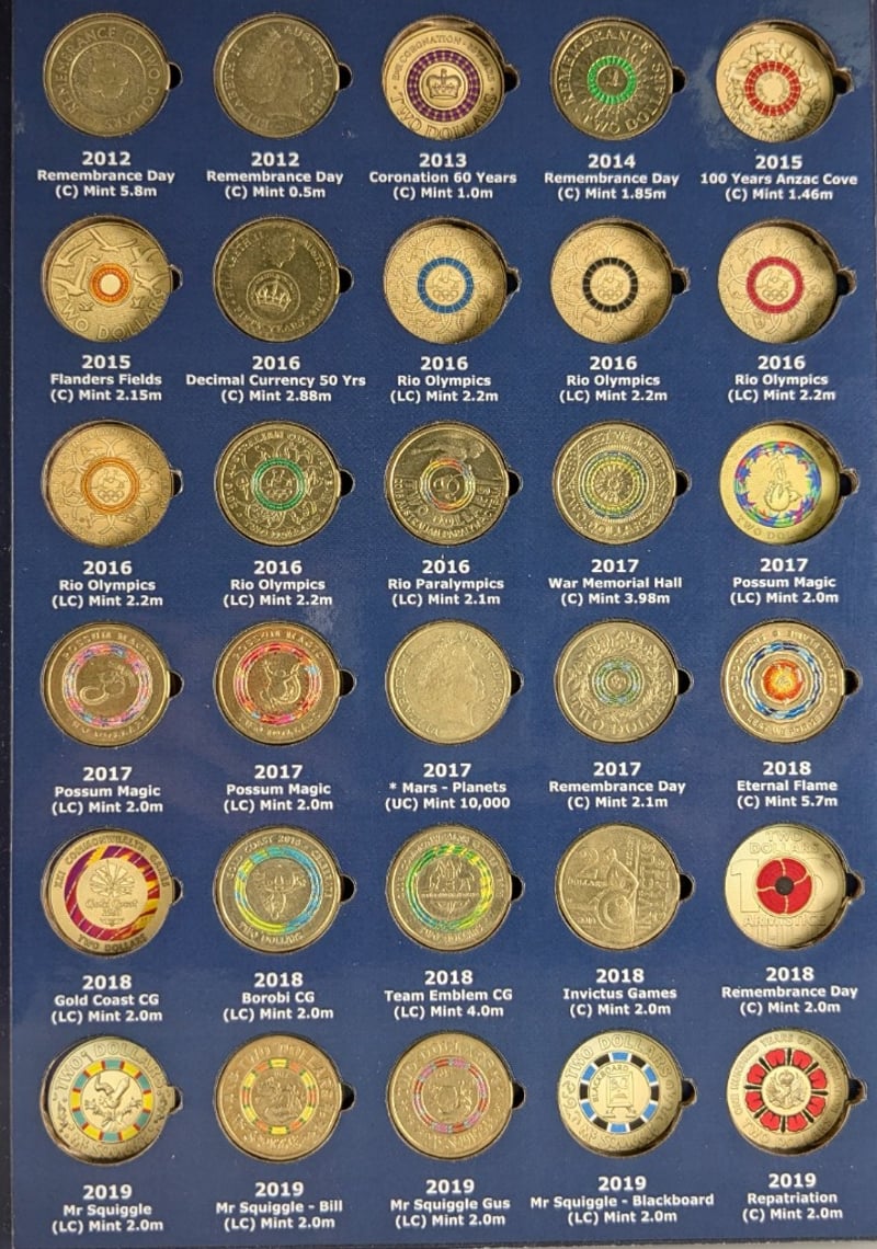 19 / 60 Coins Missing 2013, 2015 100 Years Anzac Cove, 2015 Flanders Fields, 2016 Rio Olympics Blue, 2016 Rio Olympics Black, 2016 Rio Olympics Red, 2016 Rio Olympics Yellow, 2017 Possum Magic, 2018 Gold Coast Cg, 2018 Remembrance Day, 2019 Mr Squiggle, 2019 Mr Squiggle Blackboard, 2019 Repatriation, 2019 National Police Day, 2020 End Of Wwii, 2021 Dorothy The Dinosaur, 2021 Ambulance Service, 2021 Aboriginal Flag And, 2022 75Th Peace Keeping.