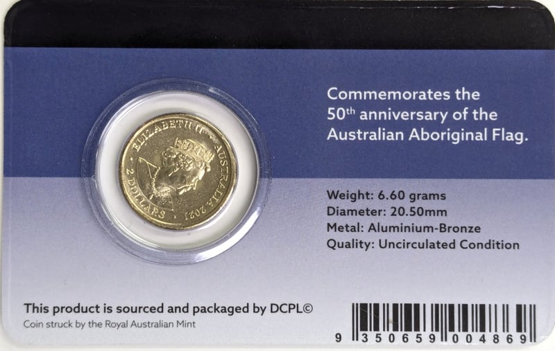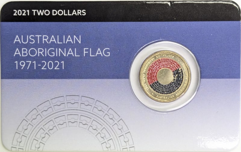 2021 AUSTRALIAN ABORIGINAL FLAG $2 COLOURED UNCIRCULATED COIN. It Was Issued By The Royal Australian Mint To Acknowledge The 50Th Anniversary Of The Australian Aboriginal Flag (1971–2021). Condition: Good FC 163120+7