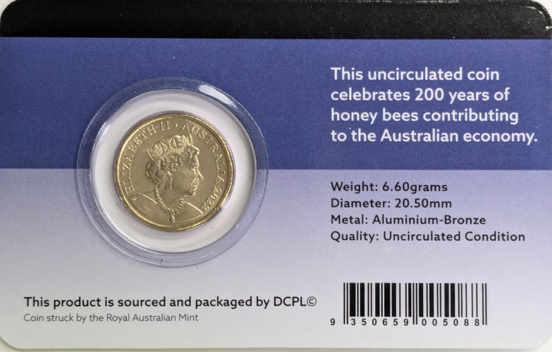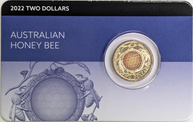 2022 AUSTRALIAN HONEY BEE $2 COLOURED UNCIRCULATED COIN PACKAGED IN A PRESENTATION CARD. Released By The Royal Australian Mint To Mark The 200Th Anniversary Of The Honey Bee Industry In Australia. It Is Made Of Aluminium Bronze, Weighs 6.6 Grams, And Is Legal Tender In Australia. Condition: Good FC 163120+8