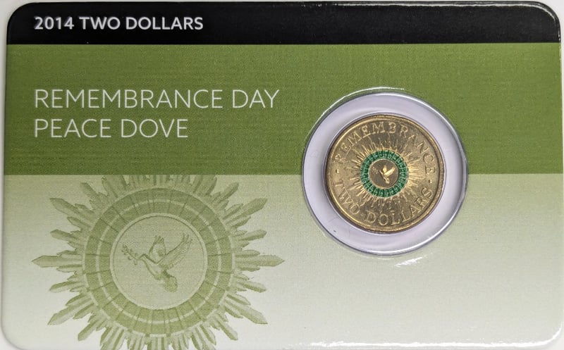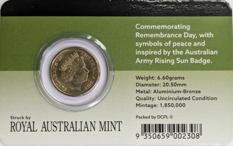2014 AUSTRALIAN ONE DOLLAR COIN COMMEMORATIVE SET PRODUCED BY THE ROYAL AUSTRALIAN MINT. It Honours Remembrance Day, Featuring Symbols Of Peace Inspired By The Australian Army Rising Sun Badge. Condition: Good FC 163120+9