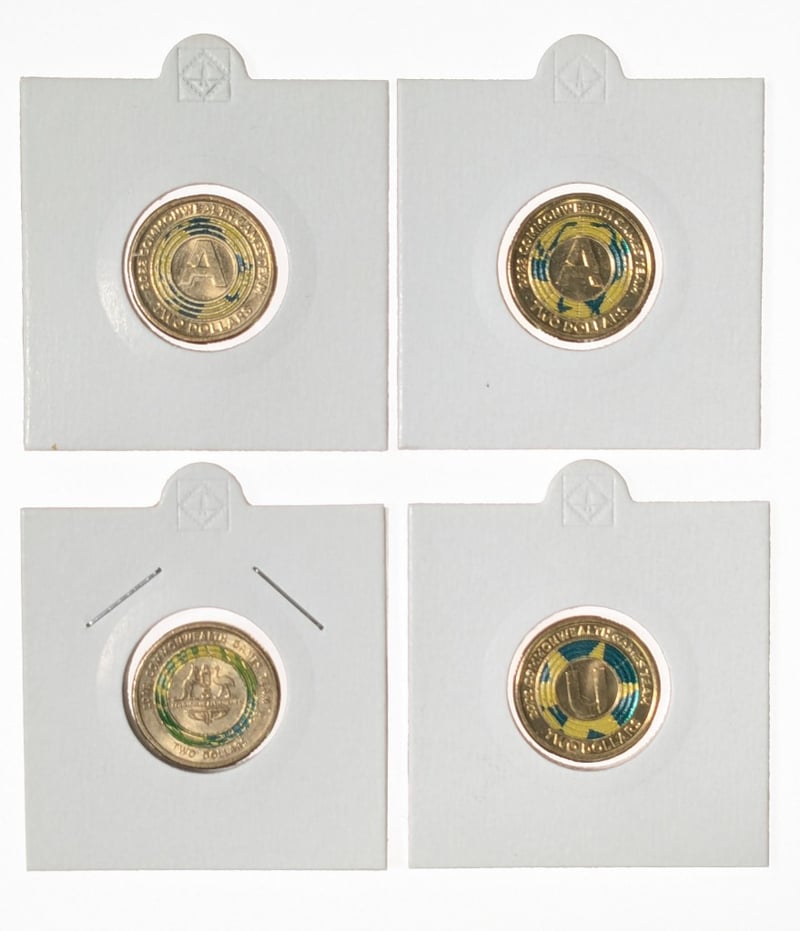 COLLECTION OF COMMEMORATIVE AUSTRALIAN $2 COINS, QTY 6. 2023 $2 Vegemite Centenary Coloured Coin, 2023 Vegemite Centenary $2 Coin, 2023 $2 "Happy Little Vegemites" Centenary Coin, Australian 2022 Commonwealth Games Team "A" $2 Colored Coin, 2022 Australian Commonwealth Games Team $2 Coin Featuring The Letter "A", 2018 Australian $2 Coin Commemorating The Xxi Commonwealth Games And, 2022 Australian Commonwealth Games Team "U" Two-Dollar Coin. Condition: Good FC 163120+15