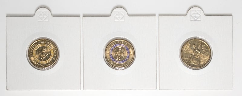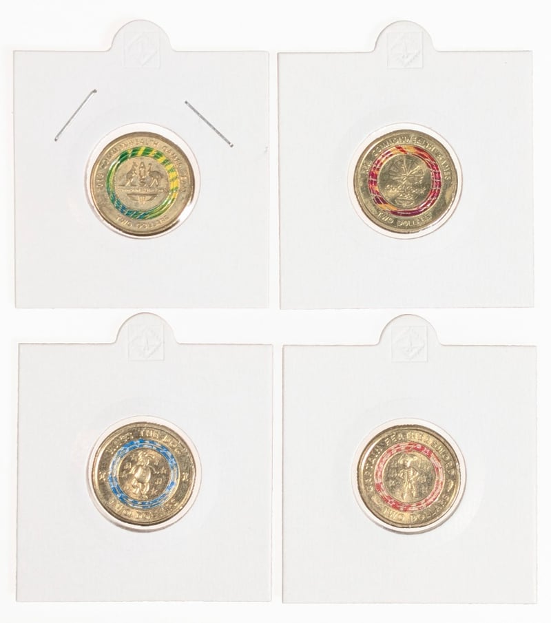 AUSTRALIAN COMMEMORATIVE $2 COINS. QTY 7. 2018 Australian Commonwealth Games Team $2 Coin Green / Yellow, 2018 Gold Coast Commonwealth Games $2 Coin Red, 2021 Australian $2 Coin Featuring Wags The Dog From The Wiggles Blue, 2021 Australian $2 Coin Commemorating The 30Th Anniversary Of The Wiggles, Featuring Captain Feathersword, 2021 Australian $2 "Dorothy The Dinosaur", 2021 Australian $2 "Henry The Octopus" Commemorative Coin, 2018 Australian Two-Dollar Coin Issued To Commemorate The Invictus Games Held In Sydney Condition: Good FC 163120+21