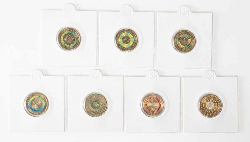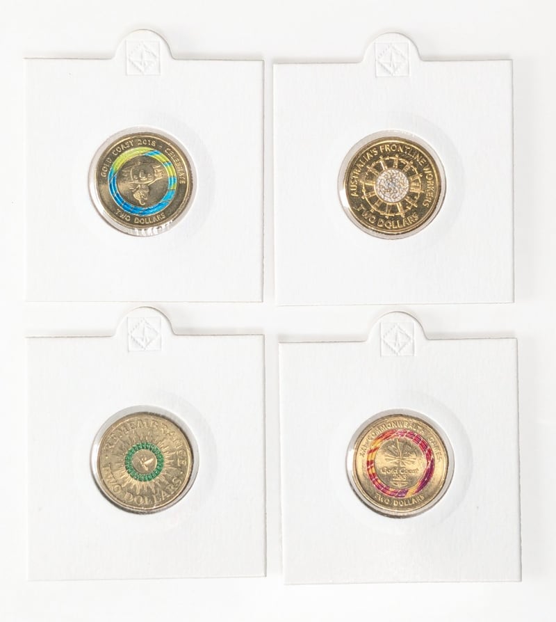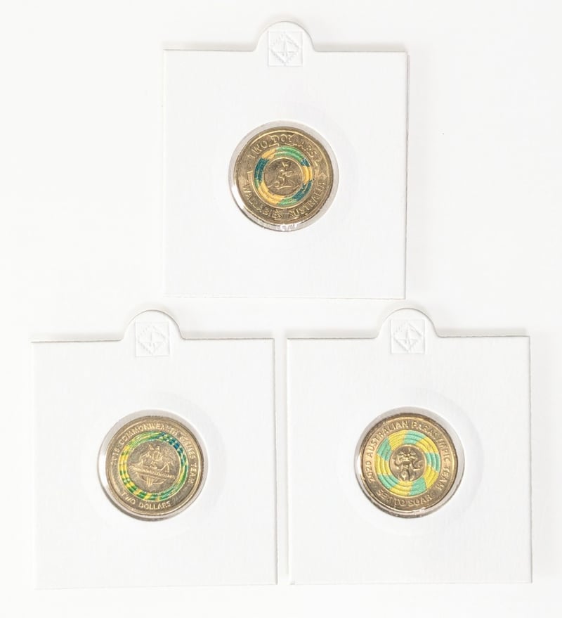 COLLECTION OF COMMEMORATIVE AUSTRALIAN $2 COINS, QTY 7 2019 Australian $2 Coloured Coin Commemorating The Wallabies Rugby Team, 2018 Australian $2 Coin Celebrating The Xxi Commonwealth, 2020 Australian $2 Coloured Uncirculated Coin Commemorating The Australian Paralympic Team, 2018 $2 Commonwealth Games "Borobi" Mascot Coin, 2022 Australian $2 Coin Commemorative "Frontline Workers", 2014 Australian $2 Remembrance Day Coloured Coin And, Australian 2018 Xxi Commonwealth Games Gold Coast Colored $2 Coin. FC 163120+22