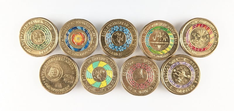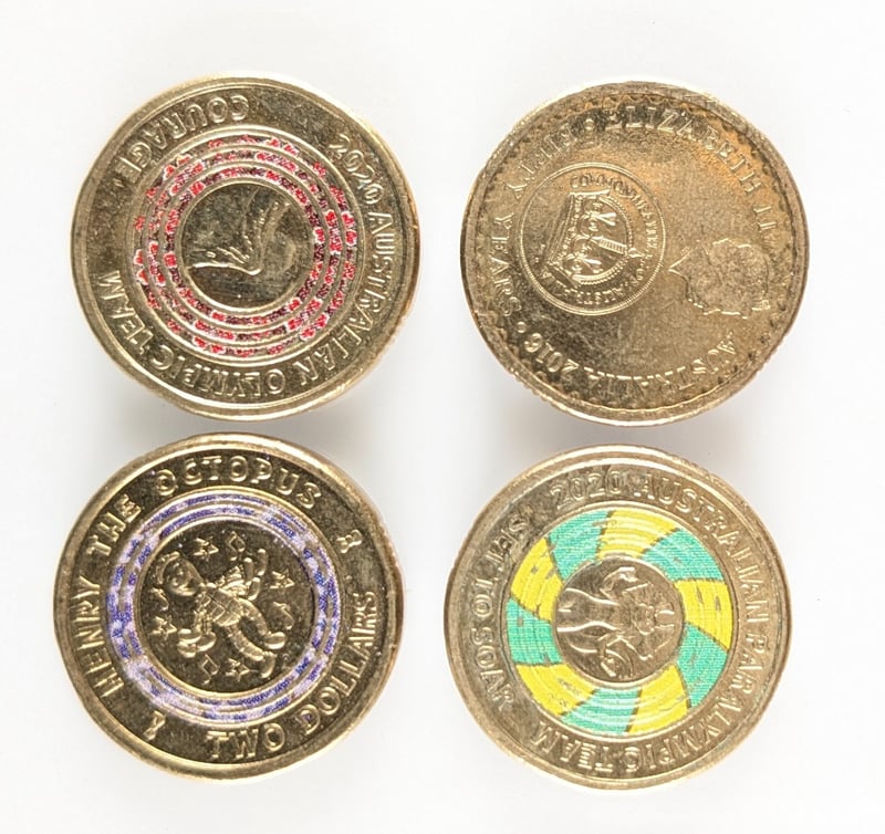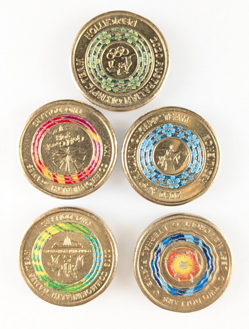 COLLECTION OF COMMEMORATIVE AUSTRALIAN $2 COLORED COINS, PRIMARILY FROM THE 2020 OLYMPIC AND PARALYMPIC TEAM SETS. 9 COINS. 2020 Australian Olympic Team "Dedication" $2 Coin, 2018 Commonwealth Games $2 Coin, 2020 Australian Olympic Team "Resilience" $2 Coin, 2018 Australian $2 Coin Xxi Commonwealth Games, 2018 Australian $2 "Eternal Flame" Coin, 2020 Australian $2 Coin "Courage", 2016 Australian $2 'Changeover' Coin, 2021 Australian $2 Coin "Henry The Octopus" And, 2020 Australian $2 Coin Paralympic Team Mascot Lizzie The Lizard. Condition: Good FC 163120+23