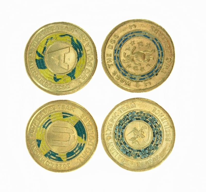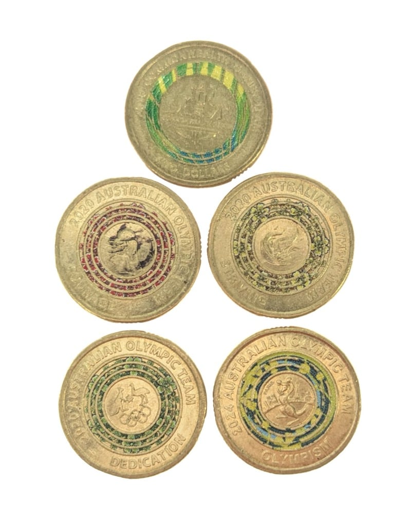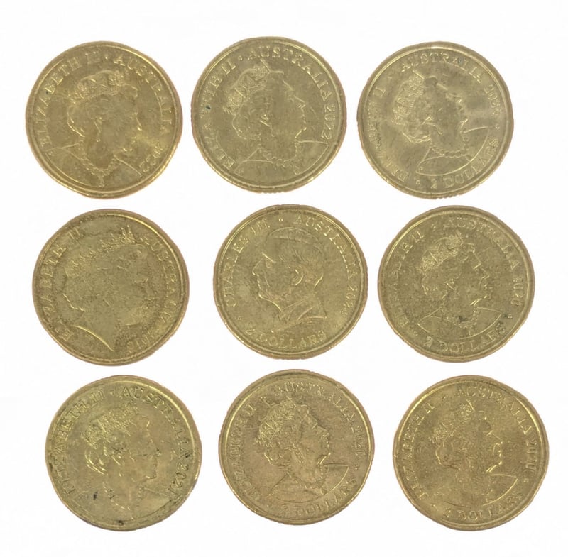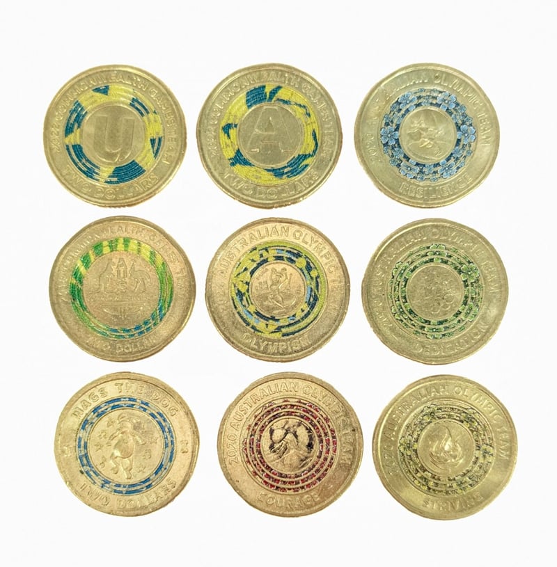 COLLECTION OF AUSTRALIAN COMMEMORATIVE TWO-DOLLAR COINS, QTY 9. 2018 Australian $2 Coin The Xxi Commonwealth Games, 2020 Australian $2 Coin Olympic Team, 2020 Australian Olympic Team $2 Coin Partnership With Woolworths, 2020 Australian $2 Coin Olympic Team "Dedication", 2024 Australian Olympic Team "$2" Coin, 2022 Australian $2 Coin Commonwealth Games Team, Australian $2 Coin "Wags The Dog" The Wiggles, 2022 Australian $2 Coin The Australian Commonwealth Games Team And, 2020 Australian $2 Olympic Team "Resilience". Condition: Good FC 163120+25