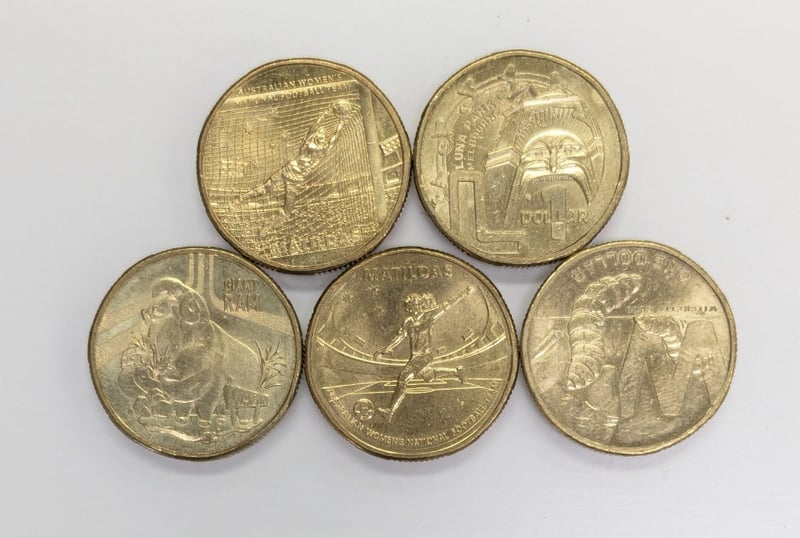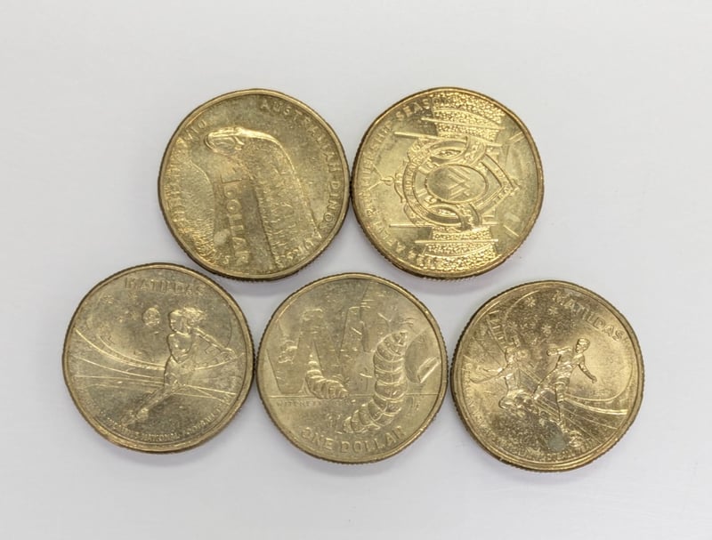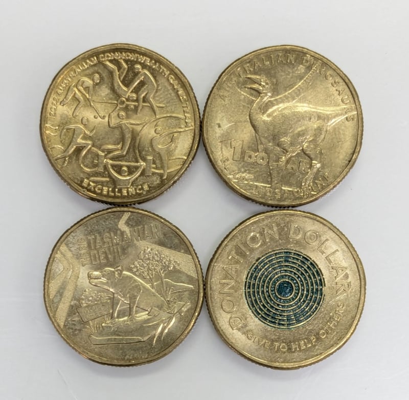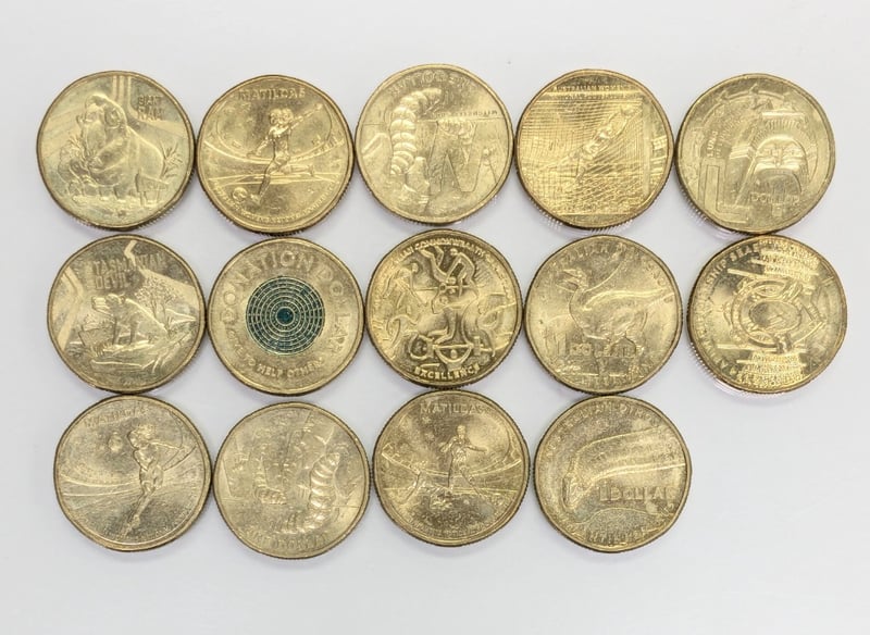 COLLECTION OF AUSTRALIAN $1 COINS, QTY 14. Collection Includes Various Commemorative Designs, Featuring Subjects Such As The Matilda'S Soccer Team, Wildlife Like The Tasmanian Devil, And Cultural Icons. One Coin In The Centre Is A Special "Donation Dollar" Featuring A Green Metallic Design. Condition: Good FC 163120+35