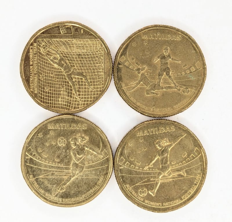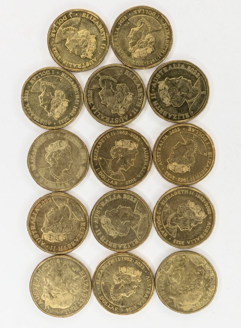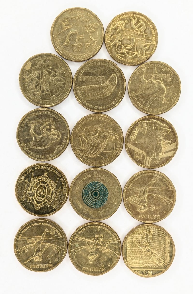 A COLLECTION OF AUSTRALIAN ONE-DOLLAR COMMEMORATIVE COINS, QTY 14. Commemorative Themes: The Coins Celebrate Various Subjects Including Australian Sports Teams Like The Matildas, The Afl Premiership Season, And Cultural Milestones. Donation Dollar: One Coin Is The Unique "Donation Dollar" Issued In 2020, Featuring A Green Color-Printed Center. These Coins Are Produced By The Royal Australian Mint And Often Feature Wildlife Or Significant Historical Events On Their Reverse Side. Condition: Good FC 163120+41