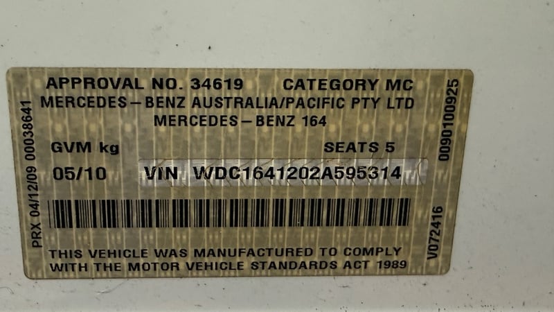 2010 Mercedes-Benz ML300 W164 ML300 CDI (Repaired Write-Off) Year: 2010 Make: Mercedes-Benz Model: ML300 Series: W164 Badge: ML300 CDI Body: 5-Door SUV Drive Type: All wheel drive Odometer: Indicating 190,489 Kilometers Engine: 3.0 V6 Turbo Diesel Transmission: 7-Speed Automatic Colour: White Seats: 5 Description/extras: 2010 Mercedes-Benz ML300 CDI (W164) All-Wheel Drive SUV. This five-door, five-seat luxury SUV features a 3.0-litre turbocharged six-cylinder diesel engine paired with a seven-speed automatic transmission, delivering refined performance and efficiency. The vehicle presents in pearl white with alloy wheels and comprehensive creature comforts befitting the Mercedes-Benz marque. The ML300 CDI represents a sophisticated blend of capability and comfort, ideal for discerning buyers seeking a premium mid-size SUV with proven reliability and prestige. Minor imperfections. Inspection recommended. VIN: WDC1641202A595314 ENG No: 64294040935235 (Repaired Write-Off) QLD, 25 Jul 2018, Inspected VIC, 30 Mar 2017, Repairable Write-off (Key #D21 carrara) Lloyds stock #657517+1 #PCV #ONETOTEN