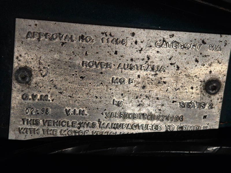 1997 MG F Year: 1997 Make: MG Model: F Body: 2-Door Convertible Drive Type: Rear wheel drive Odometer: Indicating 152,678 Kilometers Engine: 4-Cylinder Petrol Transmission: Manual Colour: Green Seats: 2 Description/extras: Air Conditioning, Power windows, SRS, Leather interior, Alloy wheels, Central locking, CD player. 1x key, 1x spare tire. No log book or manual included Wear and tear on seats and convertible soft top that comes with age. VIN: SARRDWBTCWD028004 ENG No: 18K4KJ90557105 Sold unregistered (Key #CC3) Lloyds stock #232556+1