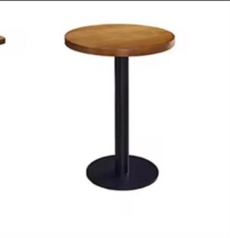 Round Cafe Table, Timber Style Table Top with a Glass Overlay and Iron Base. Dimensions Diameter 60cm x 4cm thickness Height 75cm