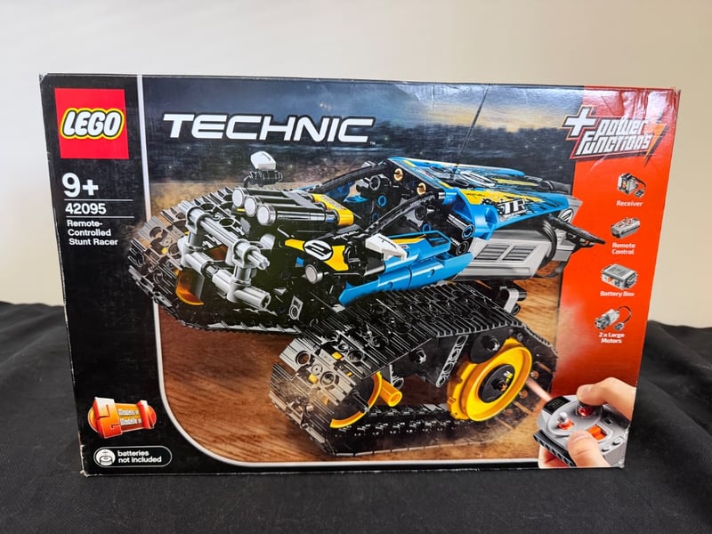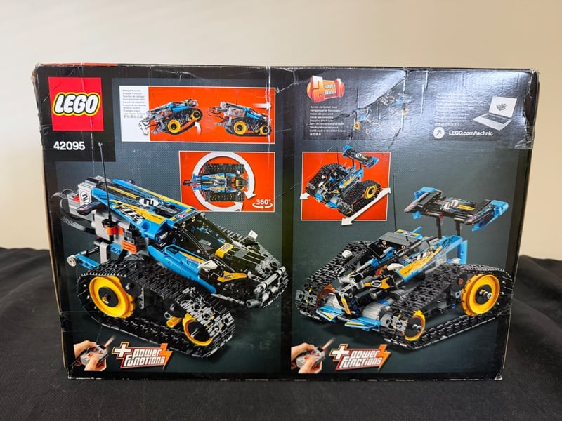Lego Technic Set 42095 Featuring A Remote-Controlled Stunt Racer With Dual-Motor Drive System, Transformable Chassis, And Tracked Terrain Capability. Includes Receiver Unit, Remote Control Transmitter, Battery Box, And Two Large Motors. Buildable Into Multiple Configurations With 360-Degree Rotation Functionality. Age Recommendation 9+. Batteries Not Included.