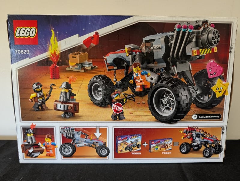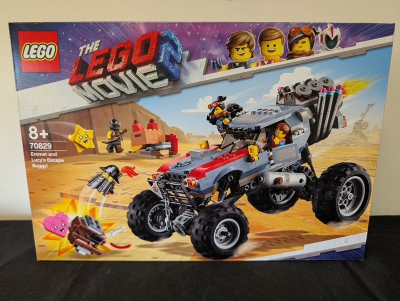 LEGO MOVIE 2 SET 70829 - EMMET AND LUCY'S ESCAPE BUGGYItem Size: Height: 40cm, Width: 35cm, Depth: 35cm, Weight: 2KgLego The Movie 2 Set 70829 Featuring Dual Escape Buggies With Poseable Figures, Flame Thrower Accessory, And Minifigure Characters From The Film; Includes Construction Manual And Original Packaging With Desert Diorama Artwork.Condition: Good - Refer To Images584530+170