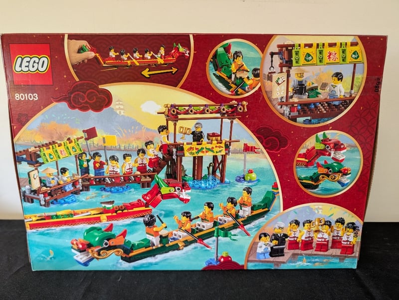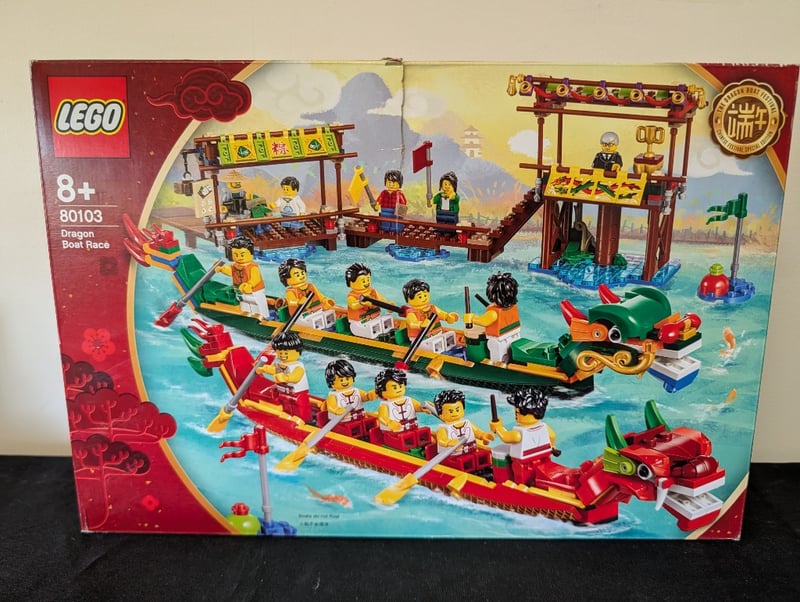 Lego Set #80103 "Dragon Boat Race" Featuring Traditional Chinese Dragon Boats, Multiple Minifigures In Festival Attire, A Wooden Dock Structure With Red And Gold Decorative Elements, And Three Distinct Racing Vessels In Red And Green With Ornamental Dragon Heads. Set Includes Approximately 15 Minifigures, Themed Accessories, And Architectural Pavilion Pieces Depicting A Chinese Waterside Festival Celebration.