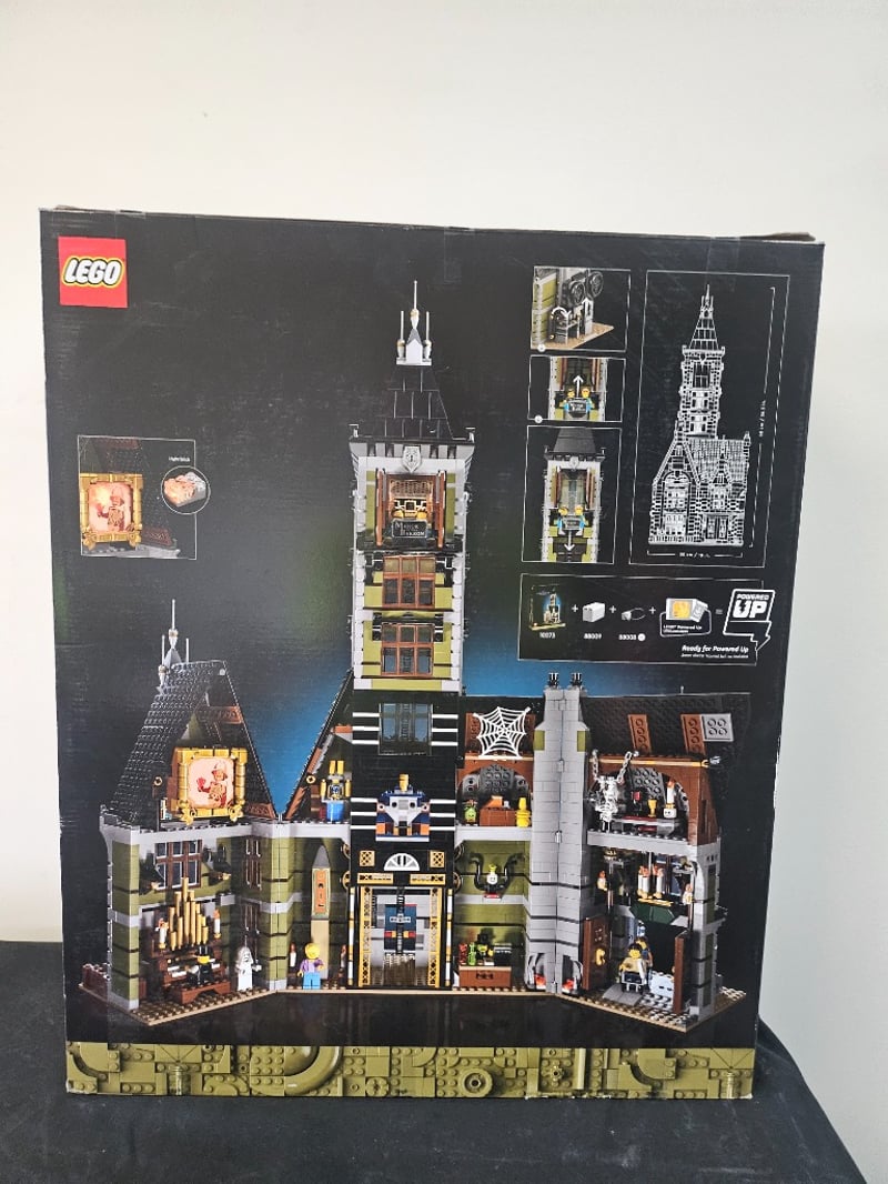 Lego Fairground Collection Haunted House (Set 10273) Featuring 3,231 Pieces With Detailed Architectural Elements Including A Tall Central Tower With Spire, Multiple Illuminated Windows With Red Frames, Ornate White And Cream Detailing, Black Roof Sections, And A Comprehensive Minifigure Collection. The Set Showcases Intricate Interior Room Displays Visible Through Transparent Sections, Including Furnished Chambers And Decorative Haunted House Theming With Spider Web Motifs And Period-Appropriate