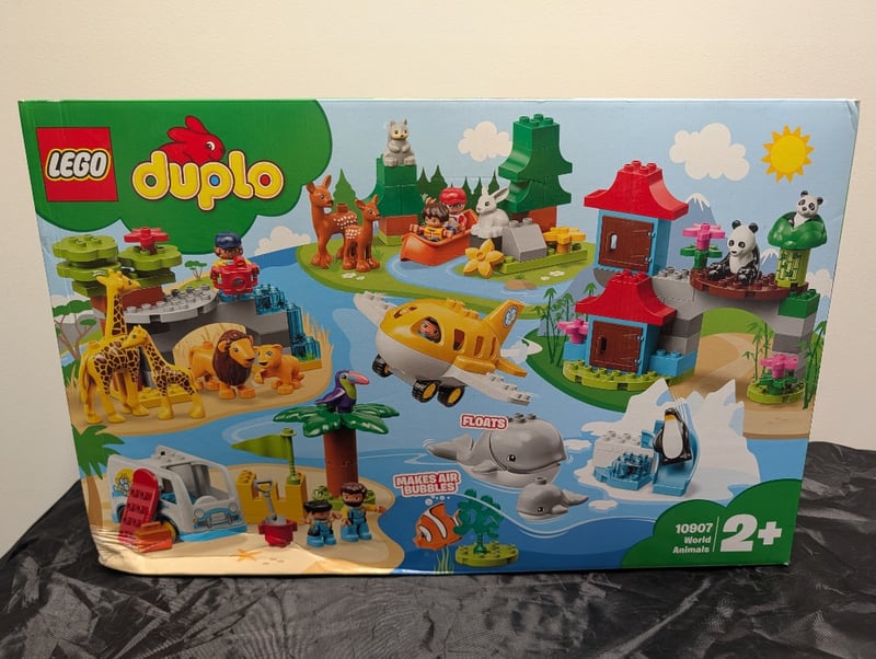 Lego Duplo World Animals Building Set Featuring Multiple Themed Environments Including Safari With Giraffe And Lion, Arctic Region With Penguin And Polar Bear, Tropical Zone With Yellow Submarine That Floats, And Coastal Area With Whale. Includes Various Animal Figures, Minifigures, And Accessory Pieces. Set Number 10907, Suitable For Ages 2+. Original Retail Packaging With Illustrated Box Showing Complete Set Contents.