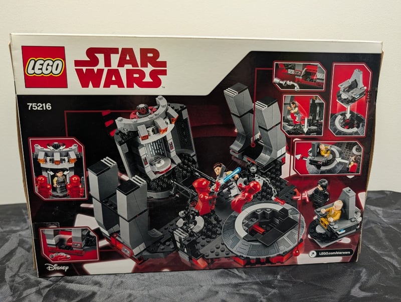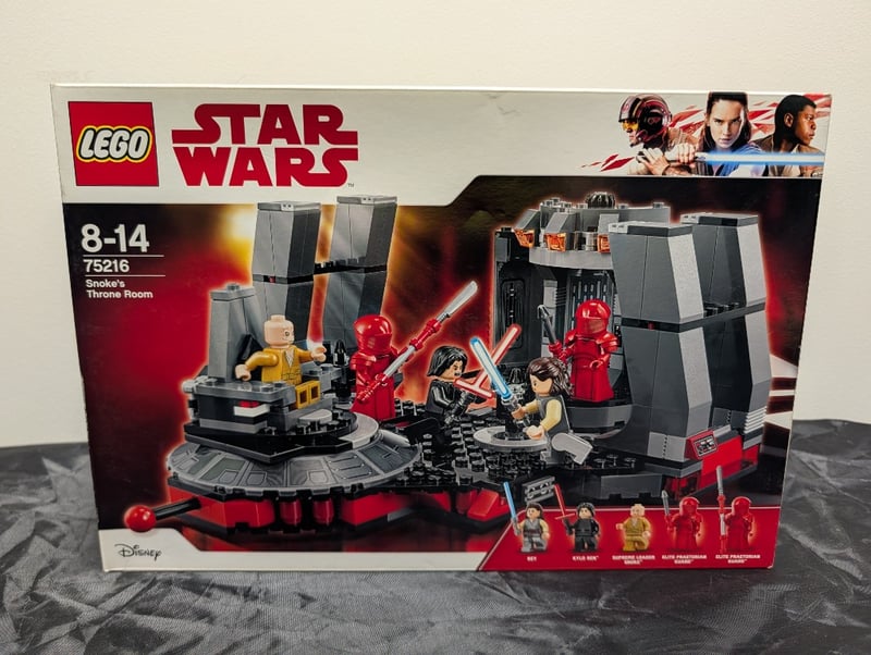 LEGO STAR WARS 75216 SNOKE'S THRONE ROOM SETItem Size: Height: 40cm, Width: 40cm, Depth: 40cm, Weight: 4KgLego Star Wars Set 75216 Featuring Snoke'S Throne Room From The Sequel Trilogy. Complete Buildable Playset Includes Modular Throne Chamber With Rotating Platform, Command Tower Structure, And Detailed Interior Chambers.Condition: Good - Refer To Images584547+141