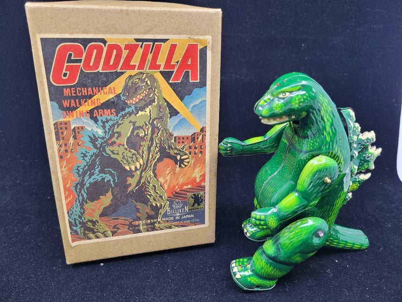 Rare 1960S Billiken Mechanical Wind-Up Godzilla Figure In Bright Green Tin With Yellow Accents. Original Cardboard Box Included Featuring Classic Atomic Monster Artwork. Articulated Arms And Walking Mechanism. Marked 'Made In Japan' With Billiken Copyright. Features Detailed Facial Sculpting, Dorsal Plates, And Original Tin Legs With Wind-Up Gearbox Visible Beneath. Collectible Kaiju Toy From Golden Age Of Japanese Tin Toy Manufacturing.