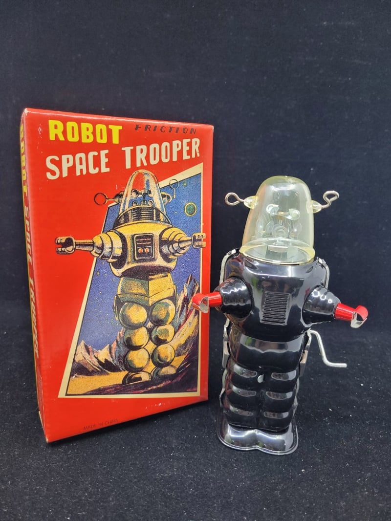 VINTAGE ROBOT FRICTION SPACE TROOPER TIN TOY WITH ORIGINAL BOX