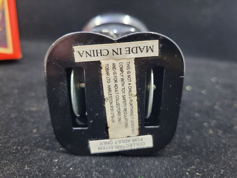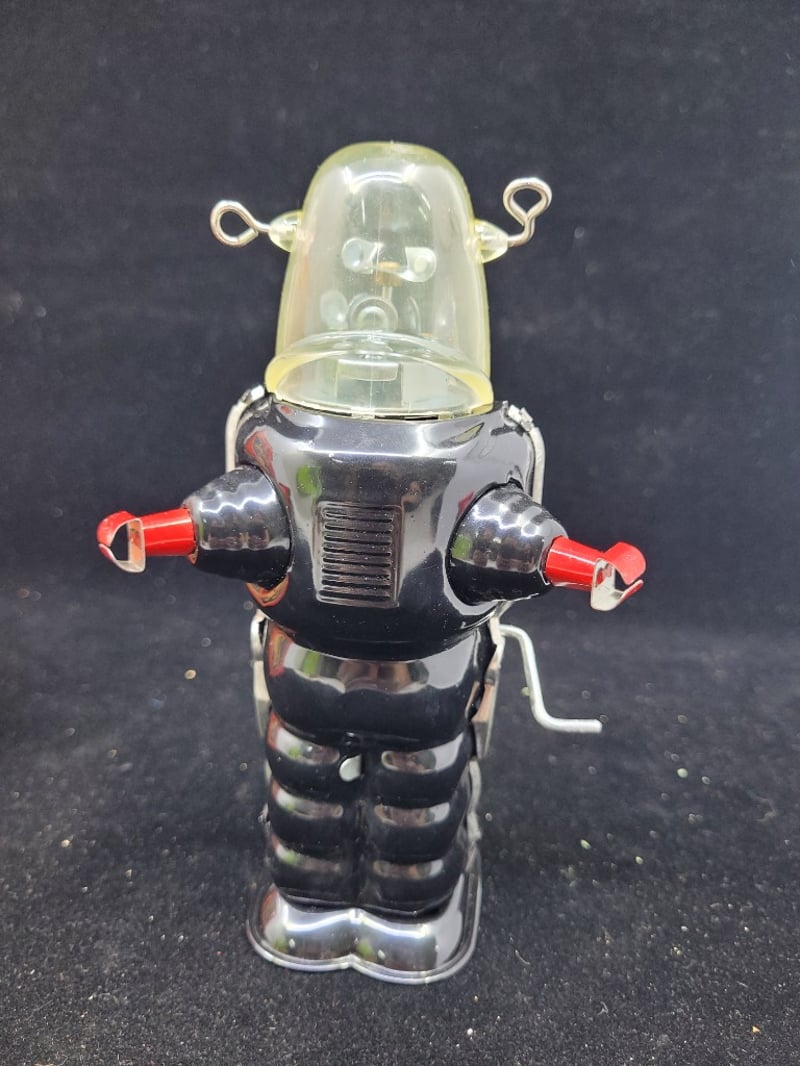 Classic Mid-20Th Century Friction-Powered Tin Robot Toy Featuring Black And Chrome Body With Clear Polycarbonate Dome Head, Red Articulated Arms, And Ribbed Segmented Legs.