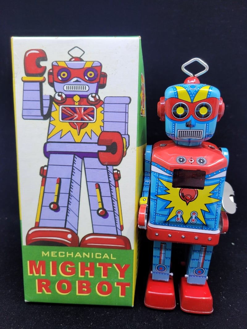 VINTAGE MECHANICAL MIGHTY ROBOT TIN TOY WITH ORIGINAL BOX