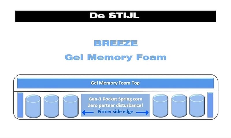 On top of the Gen-3 Pocket Spring Core there is a Blue Gel Memory Foam top to provide a smooth absorbing comfort while retaining a cooler feel every night. Besides, the Breeze has reinforced Firm Edges to reduce sinking while sitting on the side of the mattress, or when getting in/out of bed.