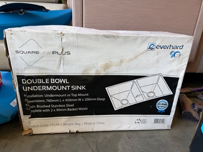 Everhard Squareline Plus double bowl undermount sink in brushed stainless steel. Features 760mm length x 450mm width x 200mm depth with two 90mm basket waste outlets. Suitable for undermount or top mount installation.