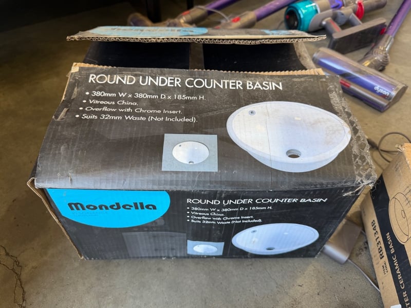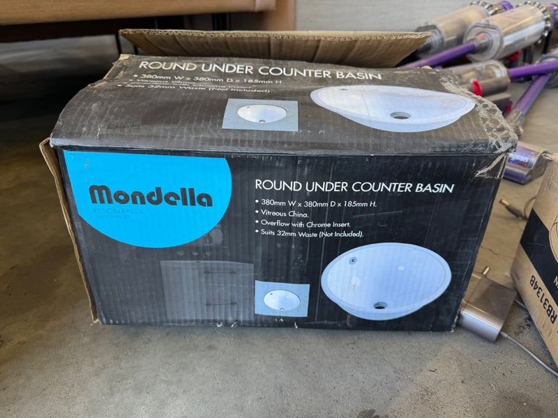Mondella Round Under Counter Basin in white vitreous china. Features 380mm width x 380mm depth x 185mm height with overflow and chrome insert. Designed to suit 32mm waste fittings (waste not included). New in original packaging with protective plastic wrapping. Ideal for compact bathroom installations requiring a space-efficient under-counter solution.