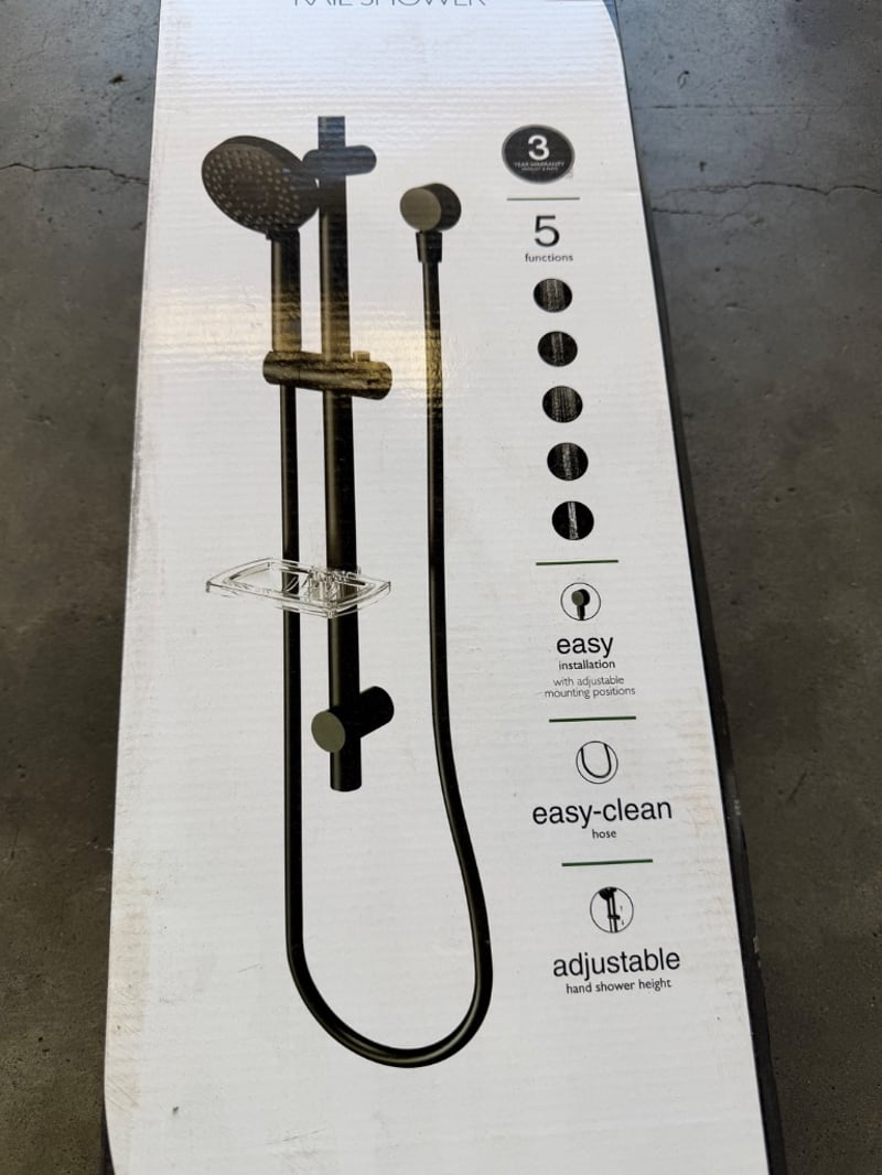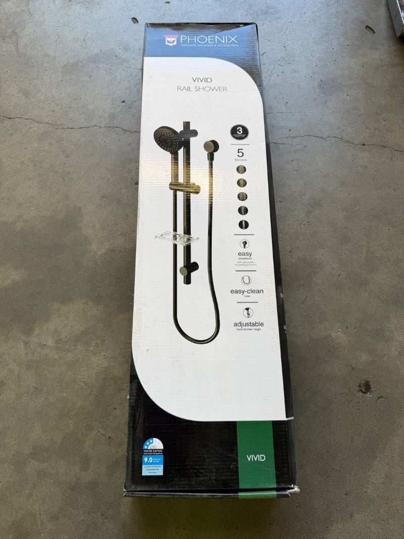 Phoenix Tapware Vivid Rail Shower in matte black and brushed brass finish. Complete 3-in-1 shower system featuring adjustable rail with 5 spray functions, round rainfall showerhead (25mm), hand shower with easy-clean hose, and integrated soap dish. Includes mounting bracket, adjustable height hand shower holder, and all installation hardware.