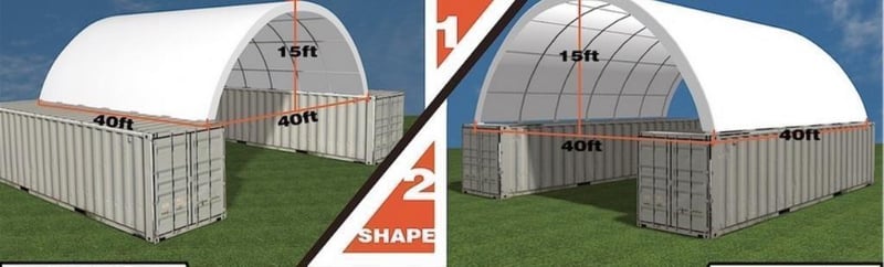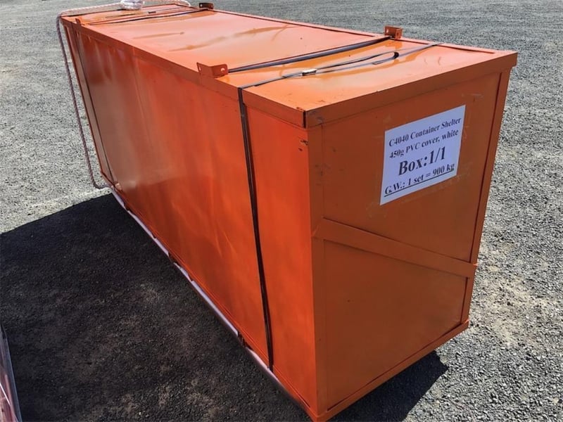 Unused Heavy duty 40ft Container Shelter, Model: C4040, 40ft wide x 40ft long x 15ft High, Heavy duty PVC fabric, galvanised tube frame, Approximate Shipping Dimensions: 2440mm L x 740mm W x 1150mm H, Approximate Weight: 900kg Location: Toowoomba, QLD