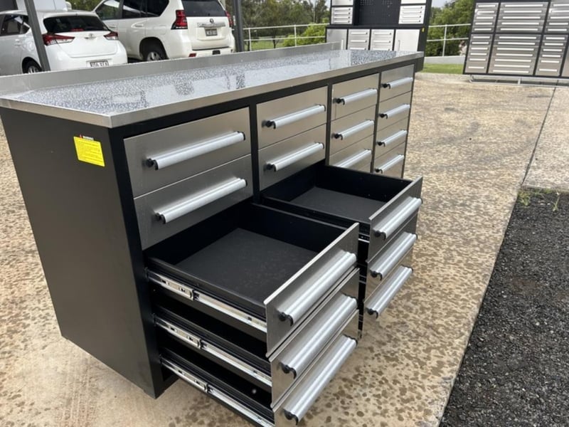 Unused 20 Drawer Stainless Steel Work Bench, Model: 7FT-20D, 3 Part Sliding Drawer System, Approximate Shipping Dimensions: L 2200mm x W 610mm x H 1100mm, Weight: 230Kgs Location: Toowoomba, QLD