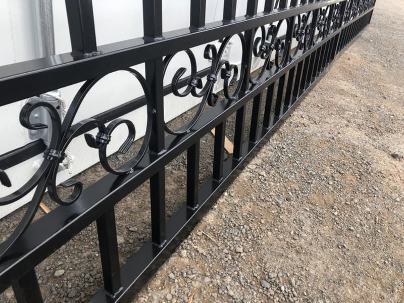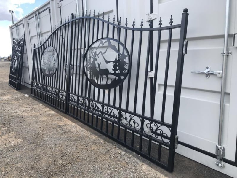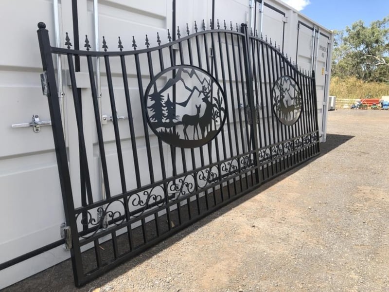 Set of 2 Large Unused Wrought Iron Style Gates with Wildlife Scene, Each gate is 10ft wide, Height at High Side: 2.3m, Height at Low Side: 1.8m, Made from Galvanised Steel, Total Approximate Combined Weight of both gates: 175kg Location: Toowoomba, QLD