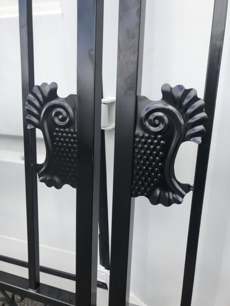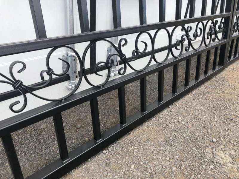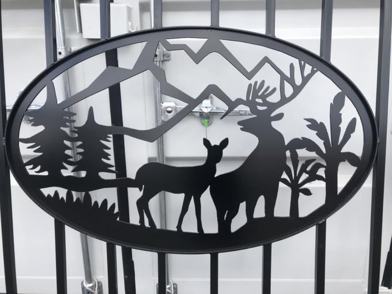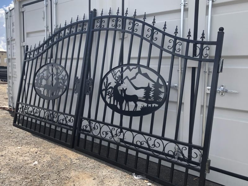 Set of 2 Small Unused Wrought Iron Style Gates with Wildlife Scene, Each gate is 7ft wide, Height at High Side: 2.3m, Height at Low Side: 1.8m, Made from Galvanised Steel, Total Approximate Combined Weight of both gates: 150kg Location: Toowoomba, QLD